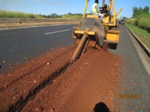 Execução de drenos profundos na BR-050, nos estados de Minas Gerais e Goiás, para drenagem de águas subterrâneas e proteção do pavimento.